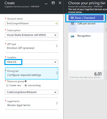- Pricing Tier - For Emotion API selected, below pricing options are listed. Let's select Standard as pricing tier. You can go with basic, which is free and available in free trial account.