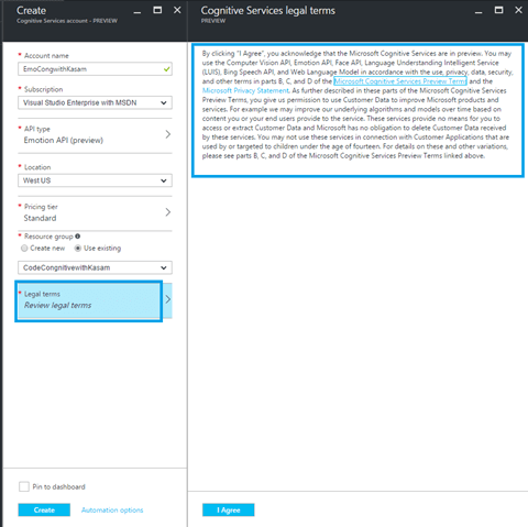 Click on "Legal Terms" option. A blade with detailed terms will be displayed. Read it carefully and then click, I Agree => Create.
