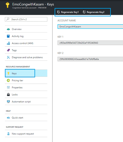 Click on "Keys" under Resource Management. This will list the key details (Key 1 , Key 2 ) which we will be using in our application to leverage the Cognitive Emotions Services.