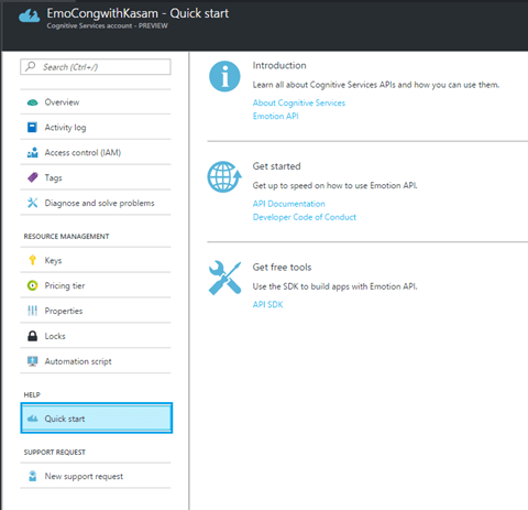 Click on Quick Start for a quick introduction of Cognitive services, API documentation, and Developer's code of conduct, along with the details of SDK available for building apps with cognitive Emotion APIs