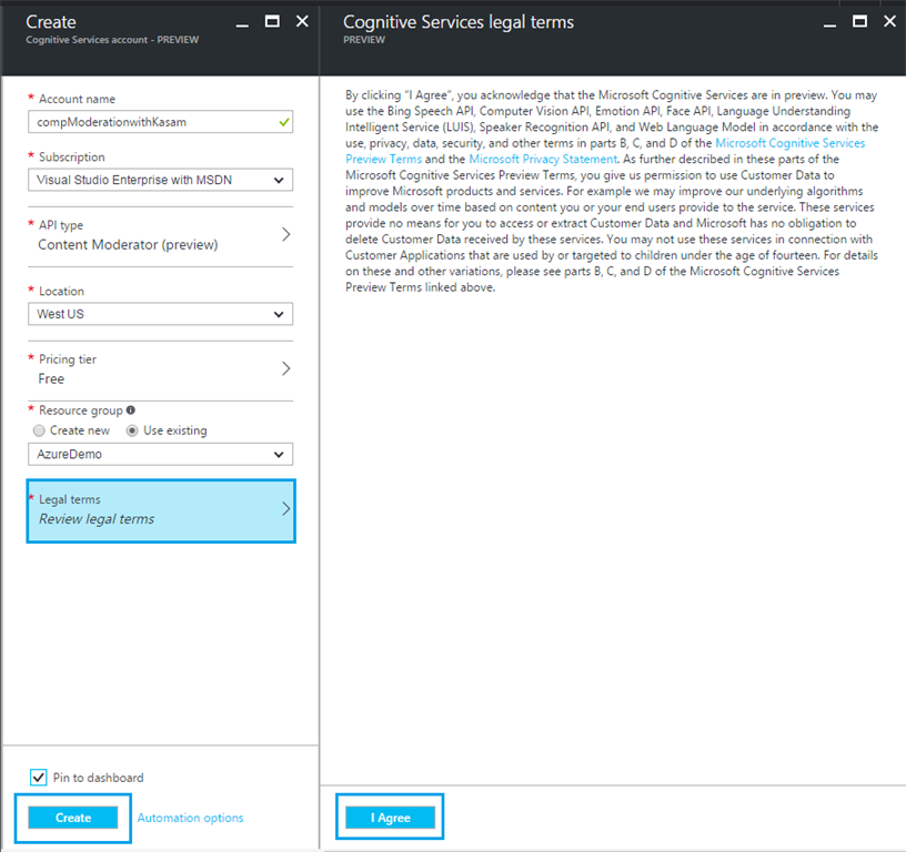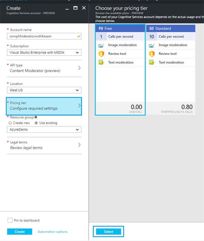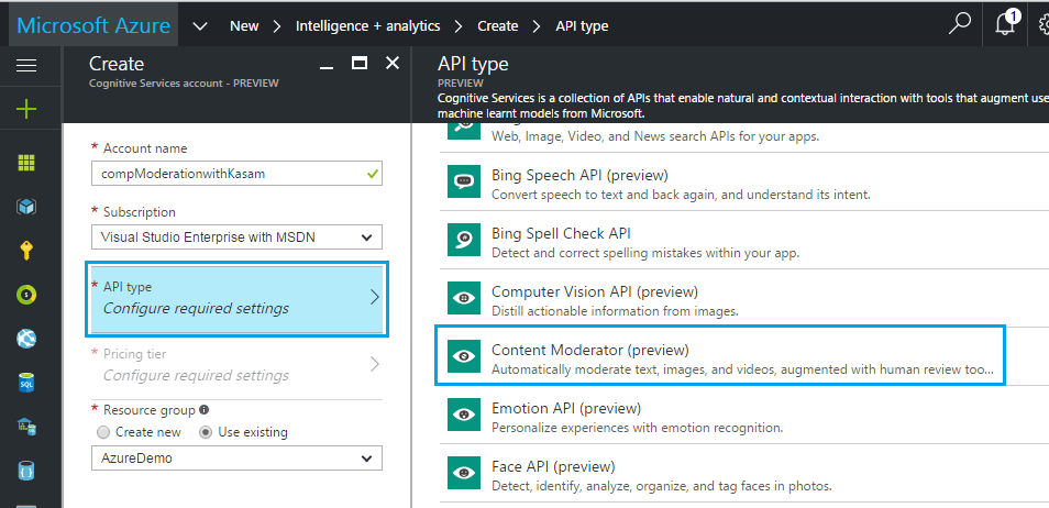 Currently, the service is in Preview and hence only available at Western US locations. Once we select Computer Moderator from the list of API types, the location would get set to ' West US'