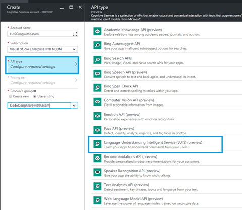 We will learn more about LUIS APIs in later articles. To start with, let's create Cognitive account to use LUIS API using Azure Portal.