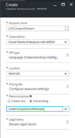 Currently, the service is in Preview and hence only available at a Western US location. Once we select LUIS API from list of APIs, Location would get set to ' West US'