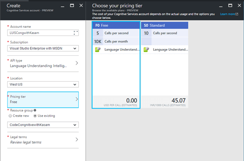 - Pricing Tier - For LUIS API selected, below pricing options are listed. Let's select Free as pricing tier. You can go with standard tier, which is available in free trial account.