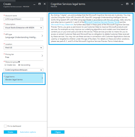 Click on Legal Terms option. A blade with detailed terms will be displayed. Read it carefully and then click = > I Agree => Create.