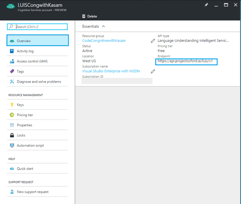 Click on Resource groups => CodeCognitivewithKasam ( Resource group selected) => Overview. LUIS API Cognitive account created will be listed. Click on account name.