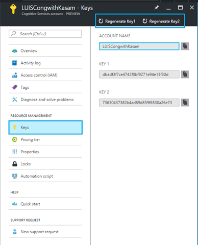 Click on Keys under Resource Management. This will list key details (Key 1 , Key 2 ), which we will be used in our application to leverage LUIS API Services.