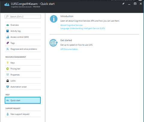 Click on Quick Start for having quick introduction of Cognitive services, LUIS, along with, API documentation to use Cognitive LUIS APIs
