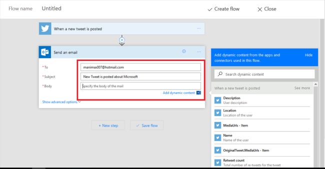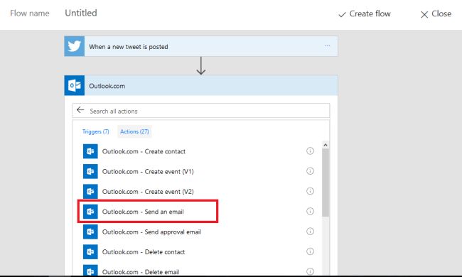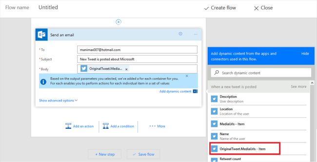 Choose the new mail action when a new tweet is posted about Microsoft, as shown below.
