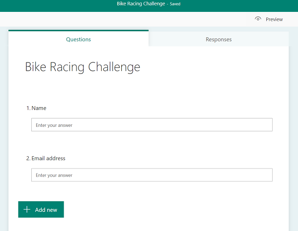 Start building the form. Give it a name. New form questions can be added by clicking on “+ Add New”. Once the questions are saved, click anywhere on the form outside. It has an auto-save feature. We will create a simple form named Bike Racing Challenge with two questions.