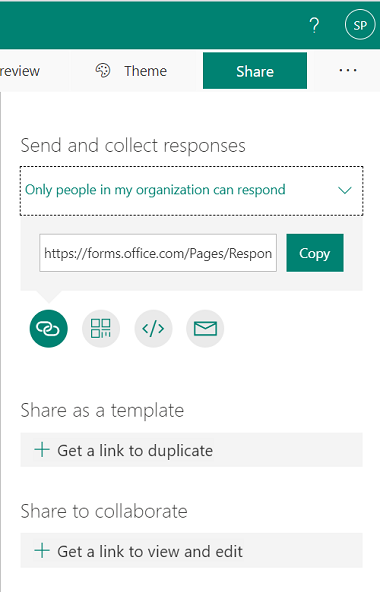 Click on Share button. Then, copy the link under the control Send and Collect Response. This control is also responsible for granting the form with public level or organization level access.