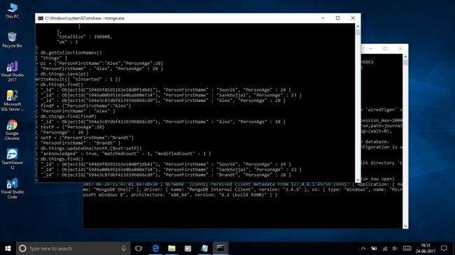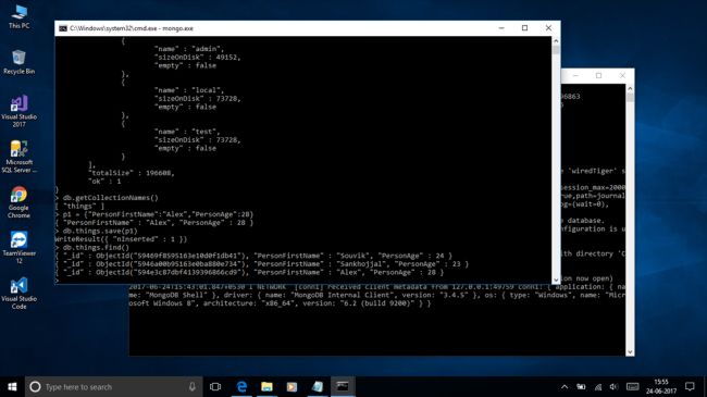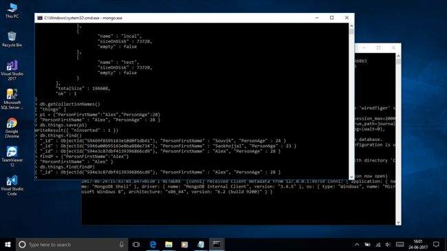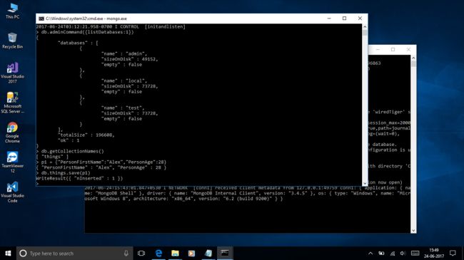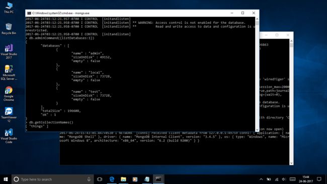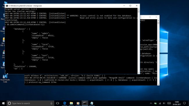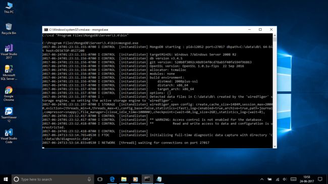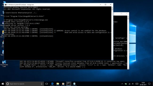 If the text "waiting for connections on port 27017" comes up, you will know the MongoDB server is up and running. Minimize this command prompt window and open up another command prompt window. Navigate to the same directory "C:\ProgramFiles\MongoDB\Server\3.4\bin" and fire up "mongo.exe".