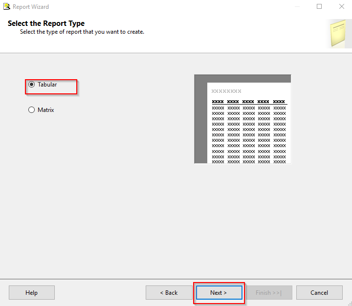 The "Report Type" window will open. Select the report as "Tabular" and click the "Next" button.