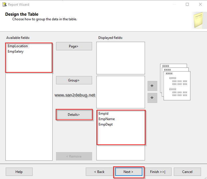 In the Table design window, add the table columns to display fields, followed by clicking "Details" button. Then, click the "Next" button.
