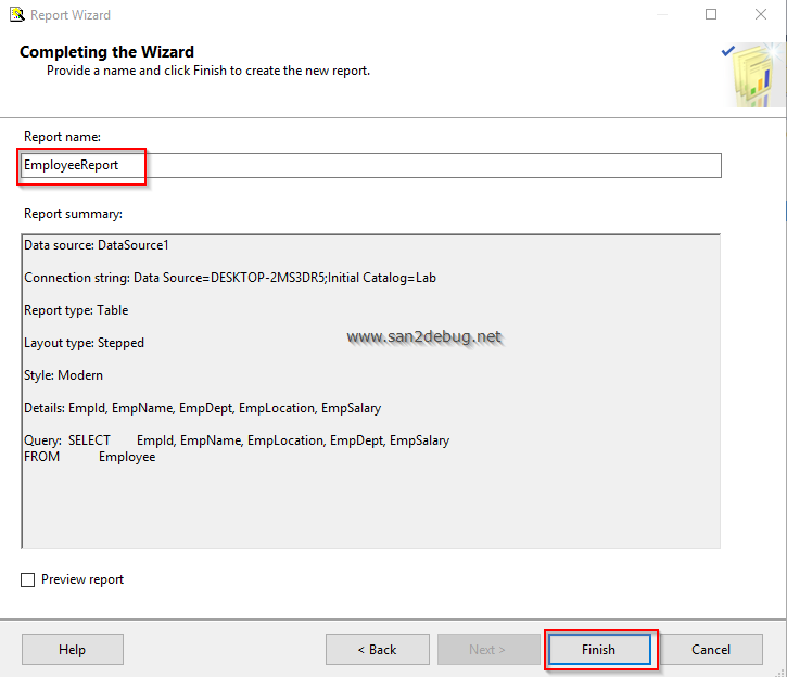 The "Completing the Wizard" window will open. Type the Report name and click the "Finish" button.