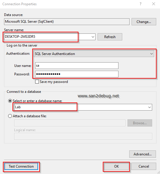 The "Connection Properties" window will open. Type the Server Name, select Authentication type, enter User name and Password, select or enter a database name. You can check the database connection by clicking the "Test Connection" button. Then, click the OK button.