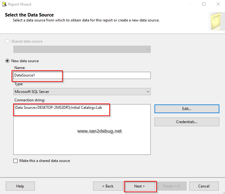 The "Select the Data Source" window will open. Select the new data source, connection string, and click the "Next" button.
