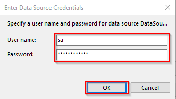 The "Data Source Credentials" window will open. Type the User Name, Password. Then, click OK.