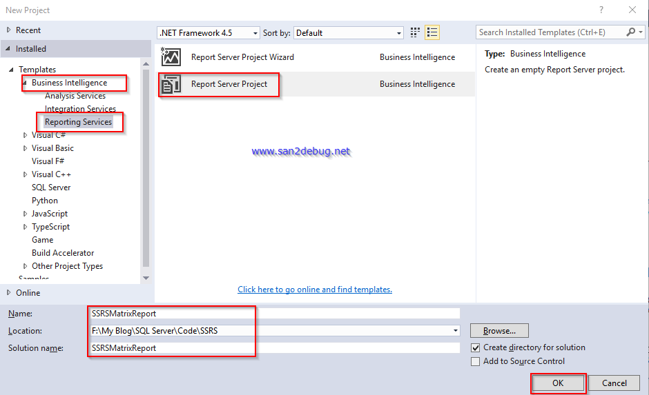 Open Visual Studio 2015. Go to File menu, point to new and click new project. New Project Window will open, you can select an installed template like “Reporting Services” in Business Intelligence Template and then select the Report Server project, type Project Name SSRSMatrixReport. Choose the project location path and click OK button.