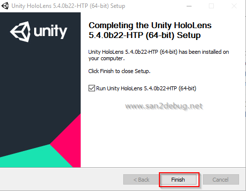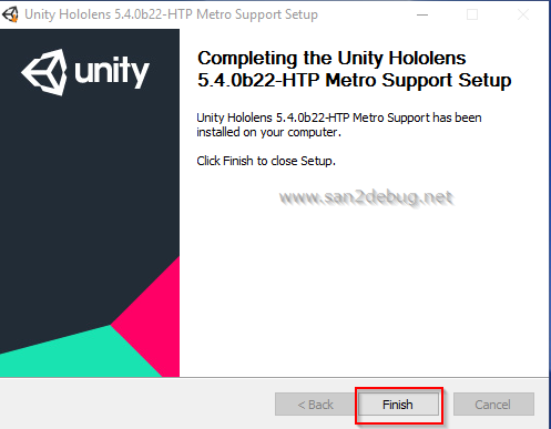 After successful installation of the Unity HoloLens Metro support software component then Click Finish button.