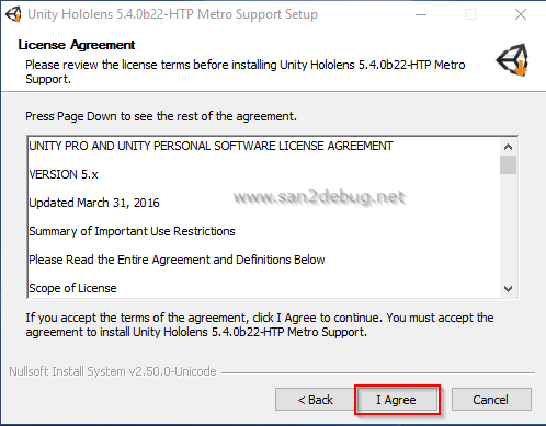 The Unity HoloLens 5.4.0b22-HTP Metro Support (64-bit) Setup window will be open, then Click Next button