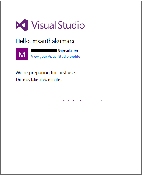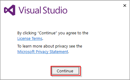 If you receive a user control prompt and click the Yes button, Visual Studio Window will open, and then click the Continue button.