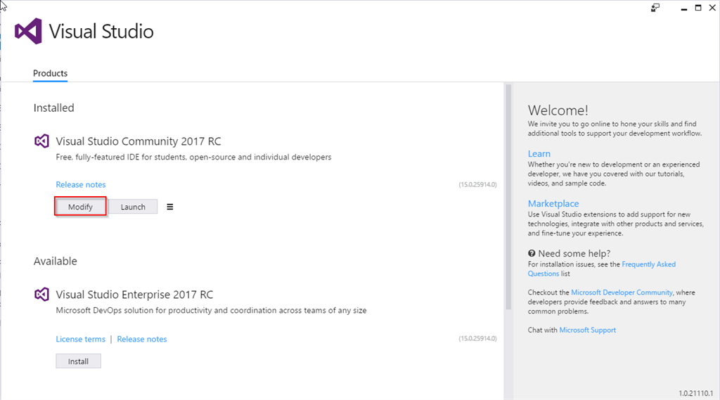 After successfully modifying Visual Studio 2017 Community 2017 RC, click Launch button.