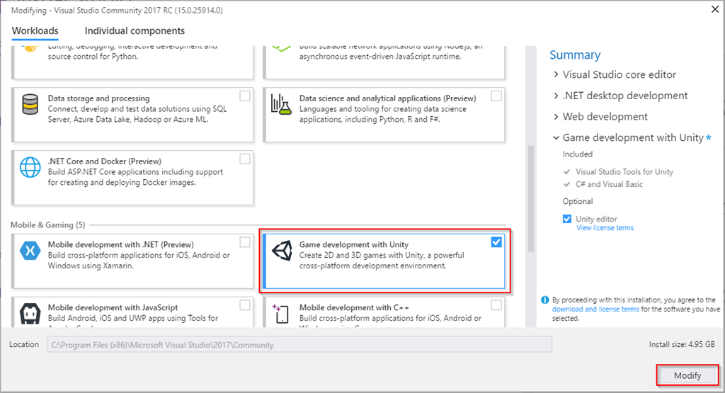 Additionally, I have selected a Game development with Unity workloads. I have continued the default location for the installation. Subsequently, click Modify button.