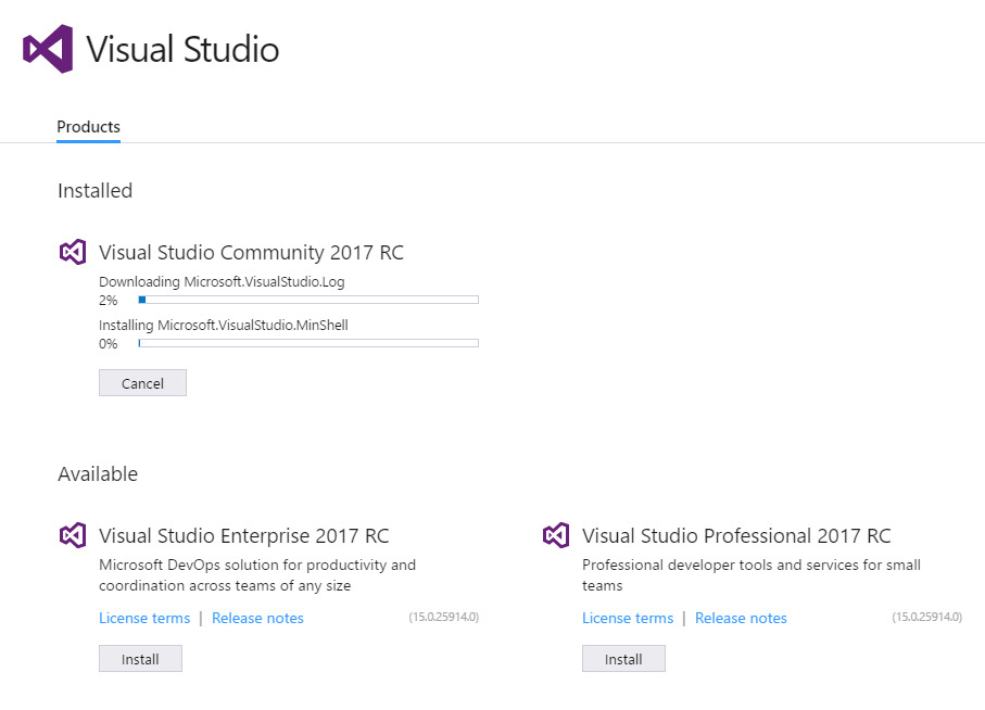 Visual Studio Products Window will open and start to download as well as install at the same time, as shown below in the screenshot. ![]()