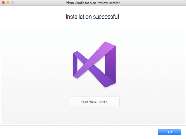 - Click ‘Start Visual Studio’ to open Visual Studio for Mac or ‘Quit’ button to close the installation.