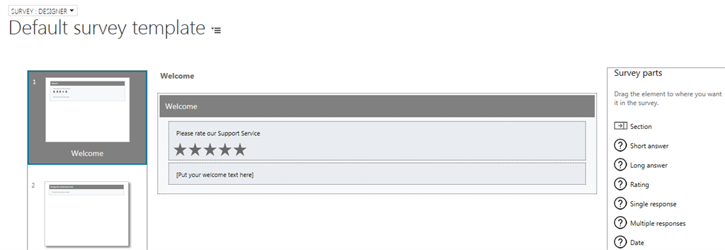 Once configured we can use it by navigating to the Voice of the Customer area. We can use survey designer to design our survey form and simply drag and drop questions from Survey parts window.