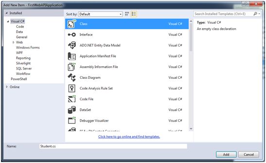 Enter the class name as Student.cs in “Add New Item” dialog box and click Add, as shown below:
