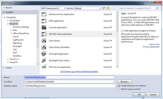 Choose ASP.NET Web Application from New project Window and give the name as “FirstWebAPIApplicaion” and click OK button, as shown below: