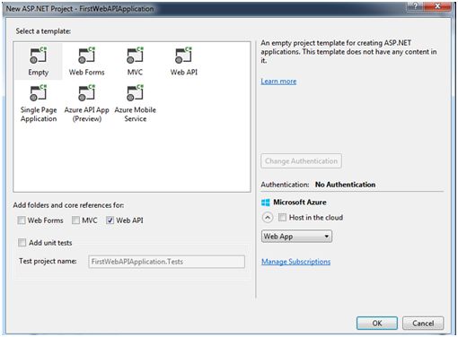 Select a template as empty and select Web API from the checkbox given below and then click OK button, as shown below:
