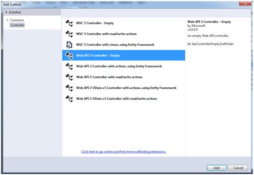 In the Add Scaffold dialog box, choose Web API 2 Controller – Empty and click Add button, as shown below: