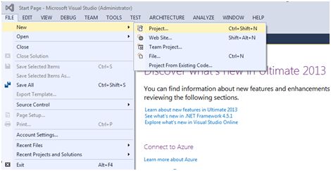 Open the Visual Studio -> Click File from top menu -> New -> Project.
