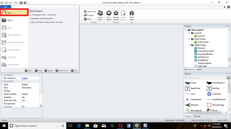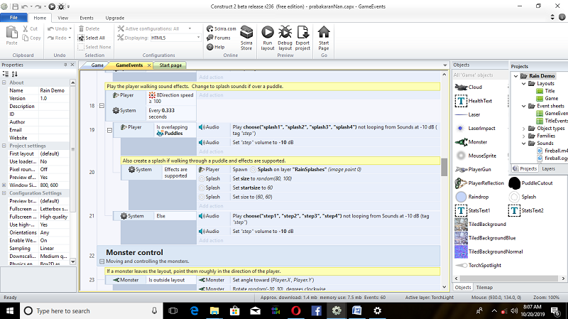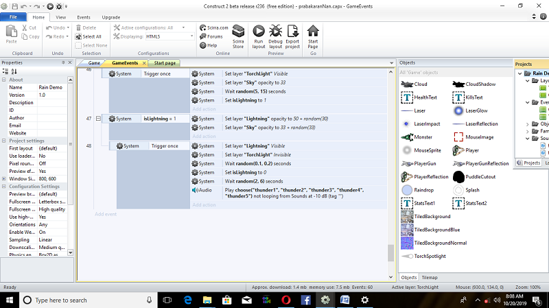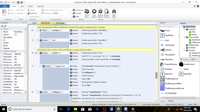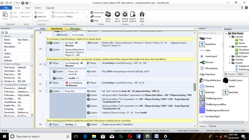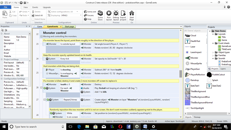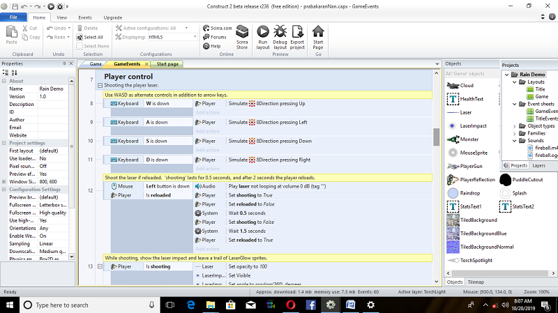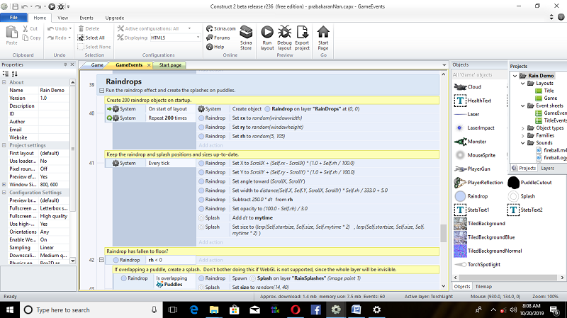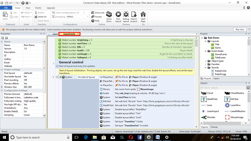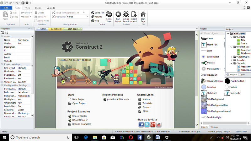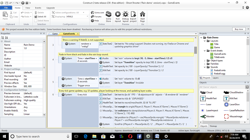 Construct 2 is an HTML5-based 2D game editor, developed by Scirra Ltd. Now in this article, I will explain about how to create Ghost Shooter Rain Fall using the Construct 2 Platform. It is aimed primarily at non-programmers, allowing quick creation of games in a visual editor and a behavior-based logic system. It is designed especially for 2D game creators, specifically for 2D games.
