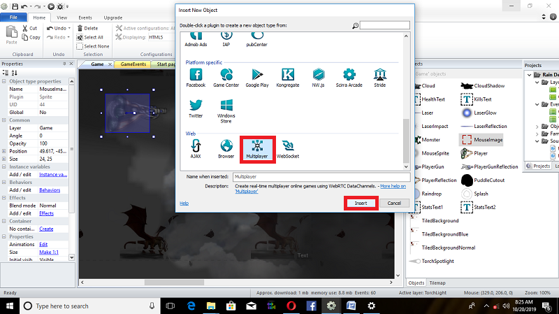 For adding the Multiplayer object, double click->in layout sheet and a new object dialog box will appear so that we can select the Multiplayer object and we can name it as Ghost Player.