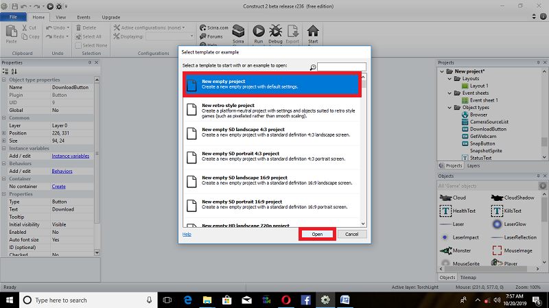 Double click -> layout sheet and a dialog box will appear, now we need to add LaserGlow and Mouse_Image object to the Game event , so that it will lead to the creation of that object in an empty event sheet.