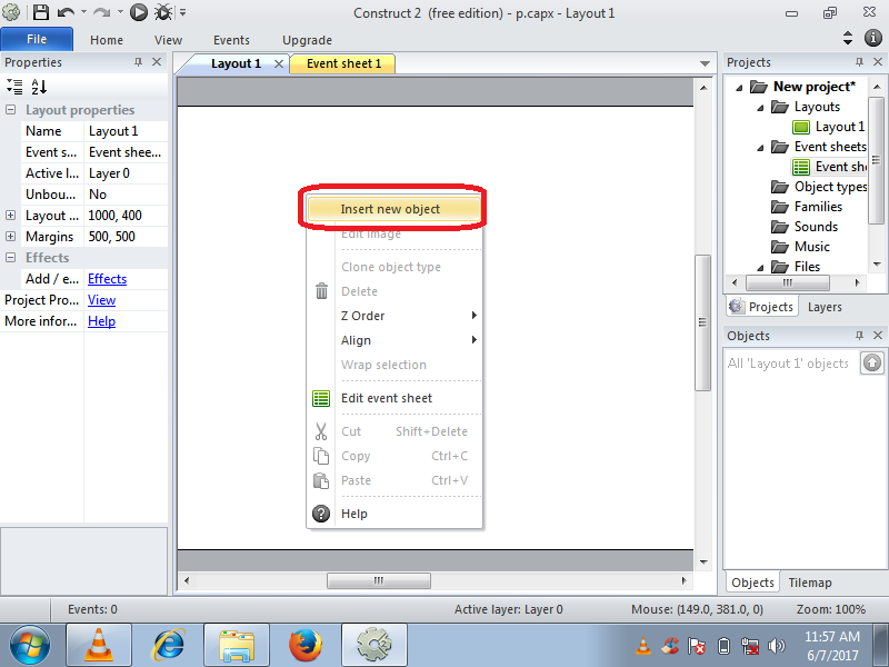An empty layout will be displayed and now we need to change the size of the layout in layout properties and the layout size must be (1000,600 ) and a new event sheet must be added and named as, game event.
