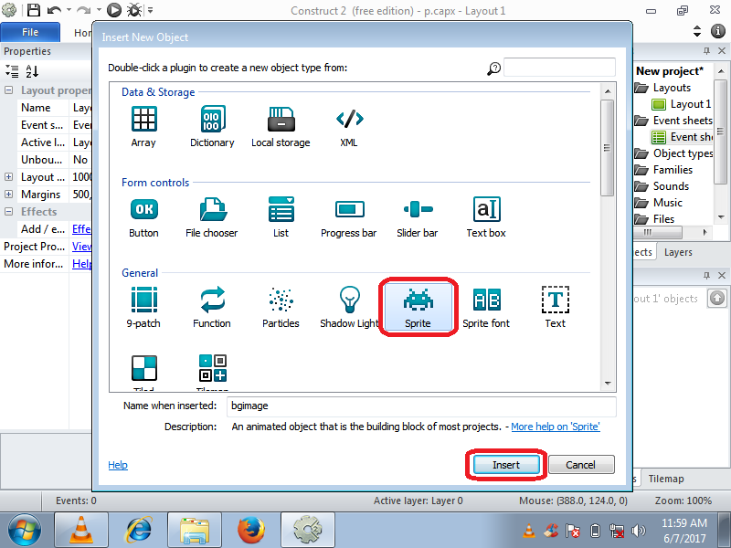 For adding the sprite object, double click->in layout sheet and insert a new object in dialog box, now we can select the sprite object named as bullet. In the in the left hand side properties window, we need to change the following conditions' Values,