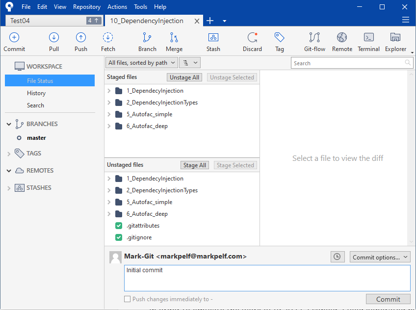 Then, I committed all the Visual Studio solutions files into the repository. Because .gitignore is set, the commit will ignore binaries, etc.