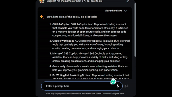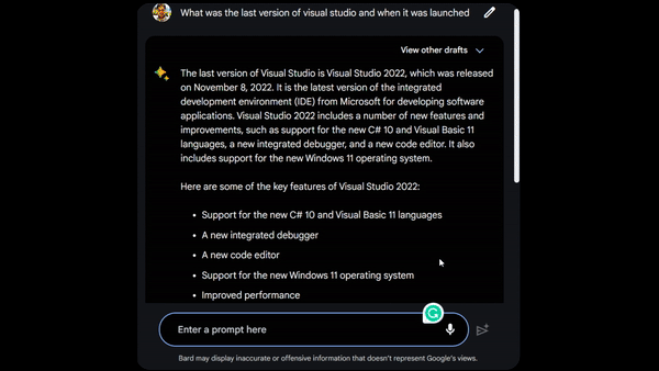 - Provide Multiple Drafts of its Response- Bard automatically generates three versions of the same response, as opposed to ChatGPT's single response, giving users options that best meet their needs.