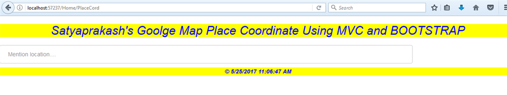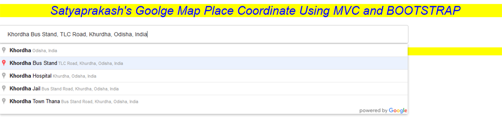 - <h2 style="background-color: Yellow;color: Blue; text-align: center; font-style: oblique">Satyaprakash's Goolge Map Place Coordinate Using MVC and BOOTSTRAP</h2>