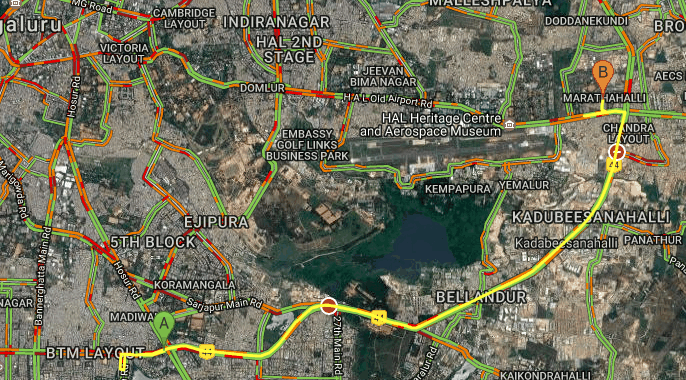 Here, with selection mode of travelling, the source and destination route will come with my specified color and along with the traffic Red mark symbol, which will come between the source and the destination.