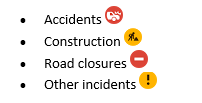 - Red- Traffic delays. The darker the Red, the slower the speed of the traffic on the road.