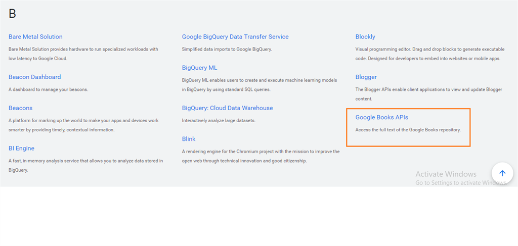 Search for Google Books API or you can scroll it down and click on B section.