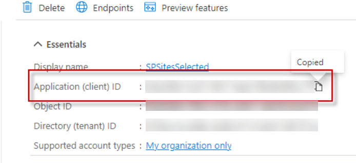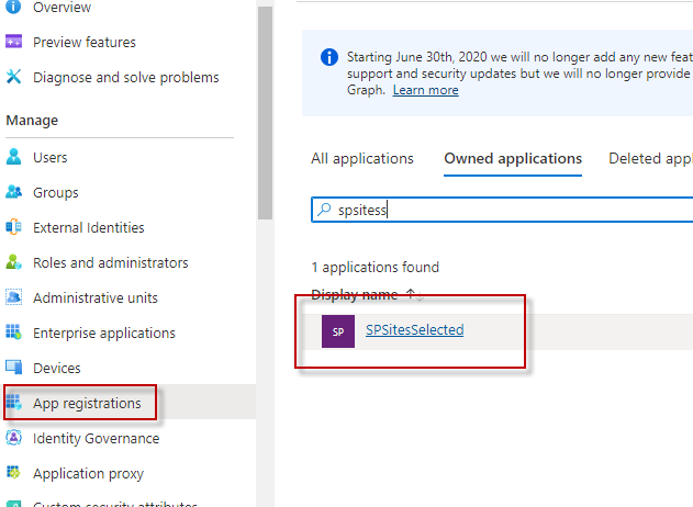 - From the quick launch, click on the ‘App Registrations’ and search for the app ‘SPSitesSelected’.