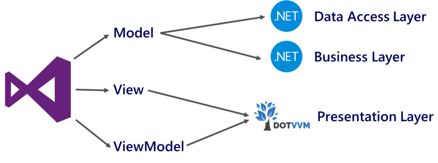 - A view model, which is a class in C# that describes the state of the page (for example, values in form fields) and handles user interactions (for example, button clicks).
