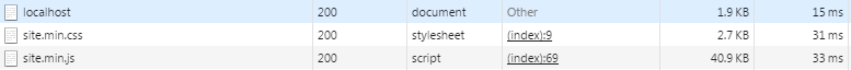 Coming back to the benefits, in the two next images it is possible to see the browser log, a before and after of changes. It is possible to see a big difference in both size and time of download. A difference between Bundle and Gulp is the process of generating a css file only by what the system is utilizing, that is, in this process the styles not used are eliminated.